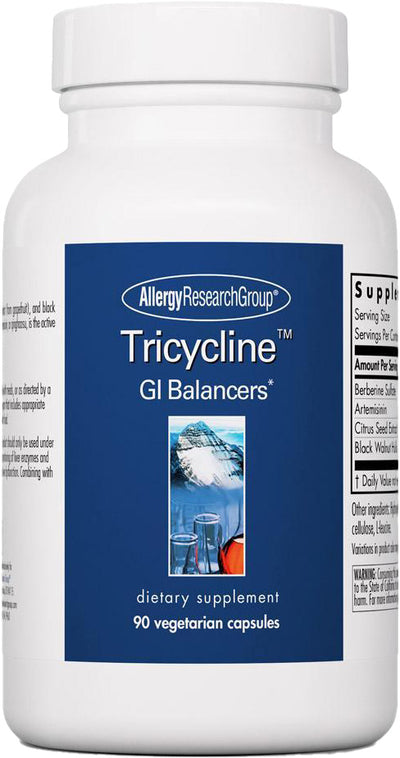 Tricycline contains berberine sulfate, artemisinin, citrus seed extract (from grapefruit), and black walnut hulls. Berberine is the active constituent of goldenseal. Artemisinin, or qinghaosu, is the active constituent of sweet wormwood (Artemisia annua). The grapefruit seed extract we use has been shown via third-party testing to be free of the potentially dangerous contaminants triclosan,...