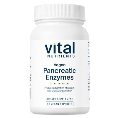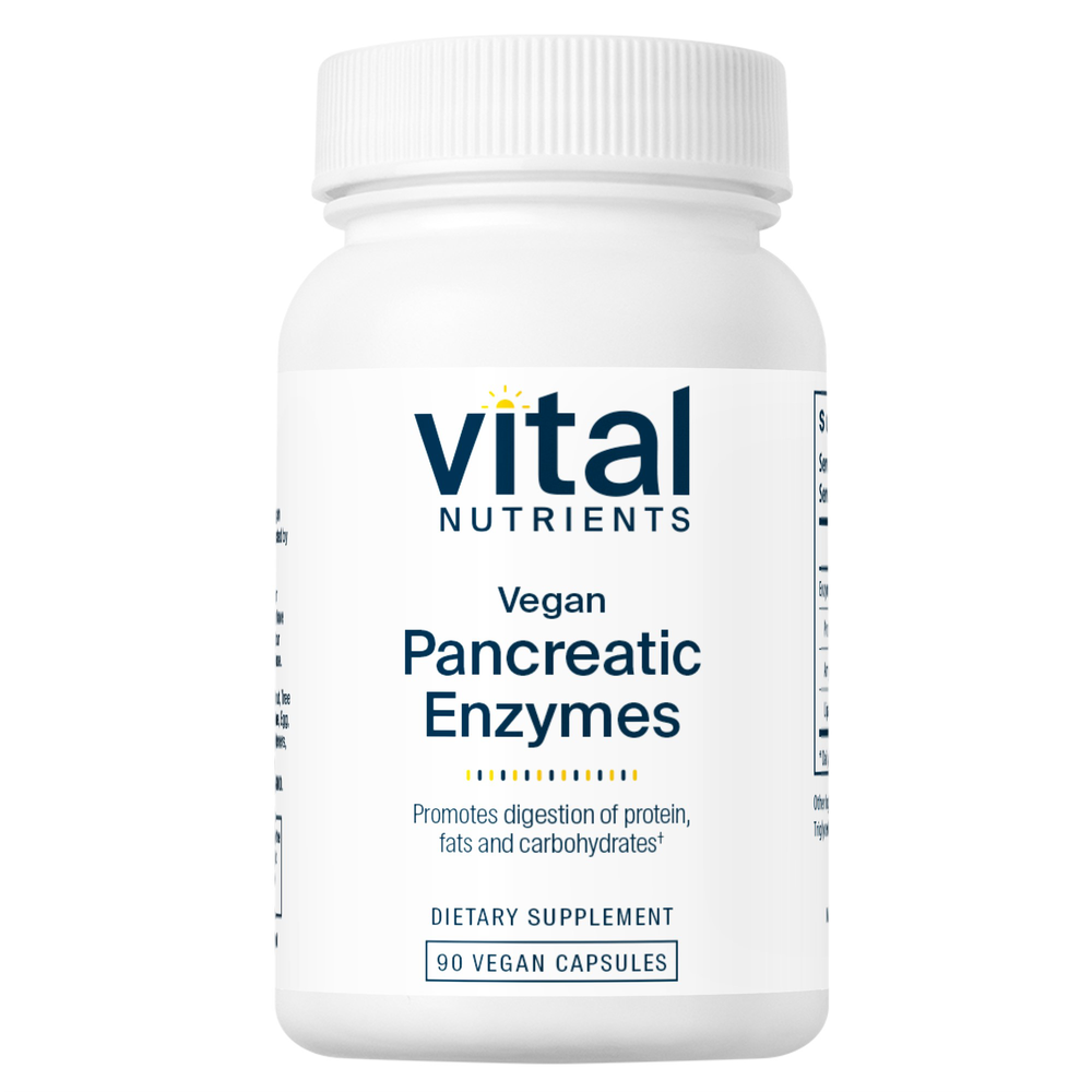 • Supplies vegan-sourced digestive enzymes • Promotes digestion of proteins, fats, and carbohydrates* • Supports optimal nutrient absorption* • Premium Vegan Formulation Digestive enzyme supplements have become popular for supporting gut health. They supply natural pancreatic enzymes that are essential for digesting and absorbing nutrients from food, ensuring you get the most out of the foods you consume.* Pancreatic enzyme dietary supplements provide support for your pancreas and entire digestive system. By helping your body break down the proteins, fats, and carbohydrates in your food, the nutrients can be released for your body to utilize. Pancreatic enzyme supplements taken with meals can also help to relieve occasional digestive issues such as indigestion, gas, heartburn, and bloating.* Most pancreatic enzymes are derived from animal sources, making them unsuitable for vegans. Vital Nutrients Vegan Pancreatic Enzymes provide lactose-free, dairy-free, gluten-free, vegan digestive enzymes. This new formula features a complete blend of highly-active protease, lipase, and amylase enzymes. These enzymes work synergistically, over a broad pH range. Their activity begins in the stomach and continues all the way through the small intestine for complete digestive support.* Packaging and labels may vary.
