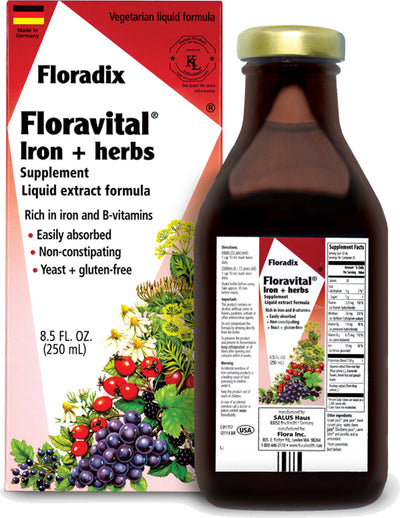 Salus Floravital® Iron + Herbs provides the same benefits as Floradix®, the best-selling natural liquid iron supplement in North America, in a yeast- and gluten-free formula. It helps fight back against iron deficiency by promoting the formation of healthy red blood cells.* Plus, this safe, low dose, liquid iron supplement is formulated for easy absorption and assimilation and is gentle on the digestive tract due to its use of ferrous gluconate, a highly soluble iron compound.