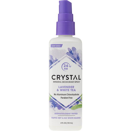 Crystal Lavender White Tea Body Spray Deodorant is a natural, aluminum-free body spray that provides effective odor protection with a refreshing botanical scent. This gentle formula combines the calming essence of lavender with the subtle notes of white tea for all-day freshness.