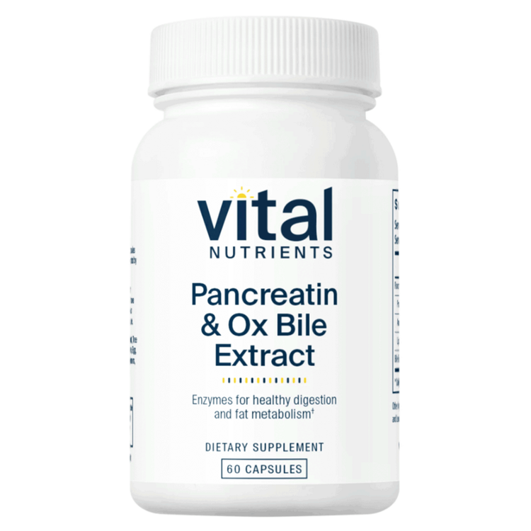Pancreatin & Ox Bile is an excellent promoter of healthy digestion.* Pancreatin contains digestive enzymes, including lipase, protease, and amylase.* These enzymes are normally produced by the pancreas and small intestine and help to maintain healthy breakdown of food such as fats, peptides, and starches in the small intestine.* When selecting pancreatic enzymes, it’s important to note that full-strength pancreatin is the preferred form to ensure it is free of lactose – a commonly used filler which can aggravate digestive complaints in the large proportion of the adult population who are lactose intolerant.* The addition of Ox Bile Extract may further support digestion and absorption of fats and fat-soluble vitamins in the small intestine. *